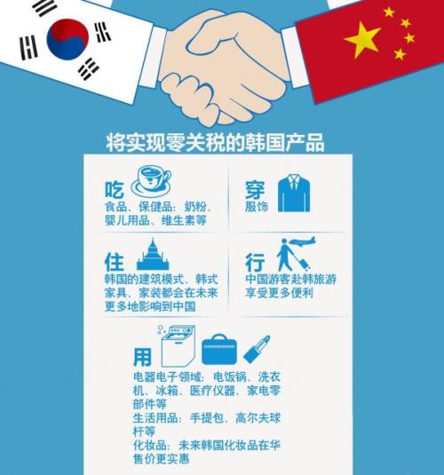 随着韩流浪潮,韩国产品已深入中国百姓家庭。据商务部消息,服装、电子产品和食品等将陆续降为零关税;服装鞋帽关税将在10到20年内由现在的15%降为0;电冰箱、电饭锅、电炒锅、电烤箱、电磁炉、微波炉、按摩仪、美容仪等家电产品将在10年内取消现在约为15%的关税。韩国食物方面,海苔关税将在10年内由15%降为0,泡菜关税将在20年内由20%改为取消,鳕鱼、冻蟹等水产品也将在10年内逐步取消关税。