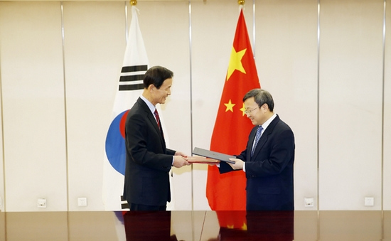 12月9日下午,商务部副部长王受文与韩国驻华大使金章洙在商务部交换外交照会,中韩双方共同确认《中华人民共和国政府与大韩民国政府自由贸易协定》将于2015年12月20日正式生效并第一次降税,2016年1月1日第二次降税。